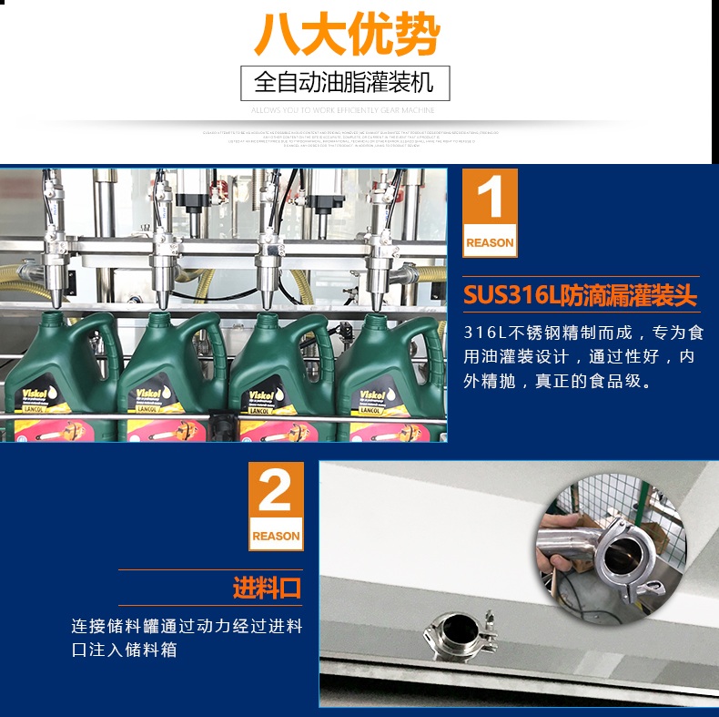 1.防滴漏灌裝頭由SUS316L不銹鋼精制而成,專為食用油灌裝設計,通過性好,內(nèi)外精拋,真正的食品級.