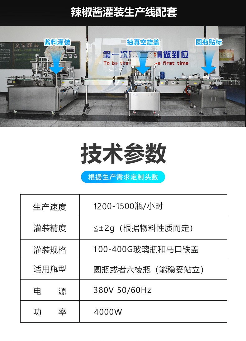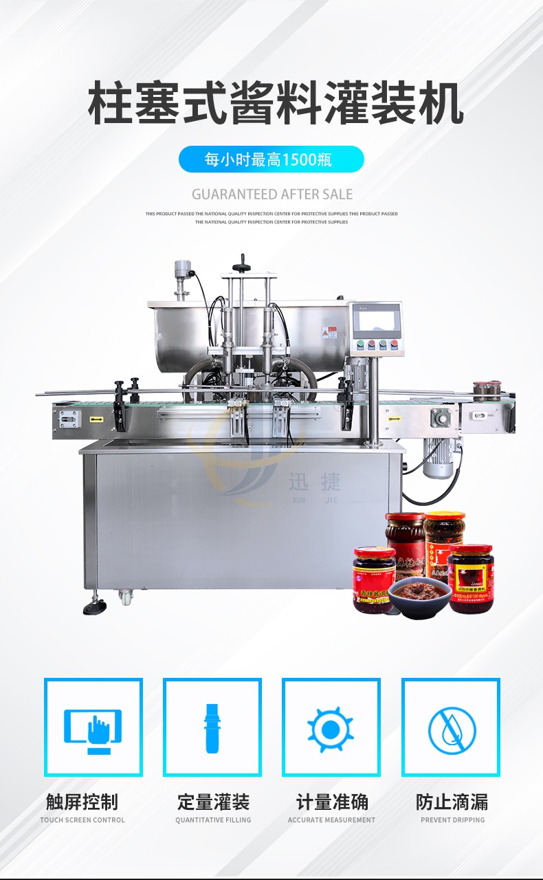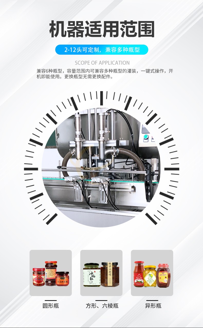 全自動(dòng)雙頭醬料灌裝機(jī)兼容6種瓶型,容量范圍內(nèi)可兼容多種瓶型的灌裝,一鍵式操作,開機(jī)即能使用。更換瓶型無(wú)需更換配件。