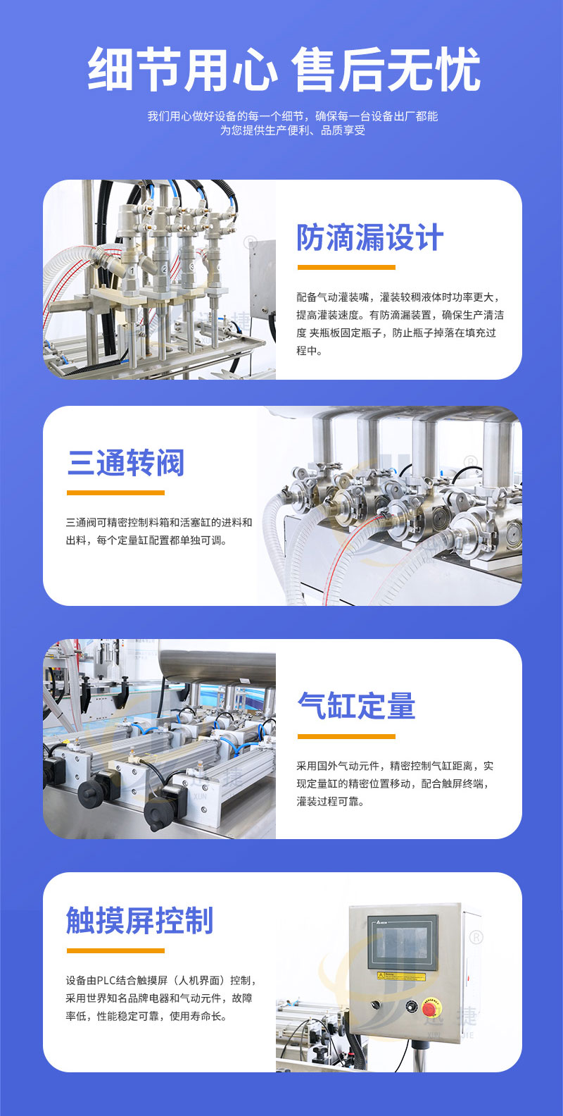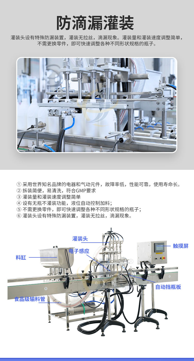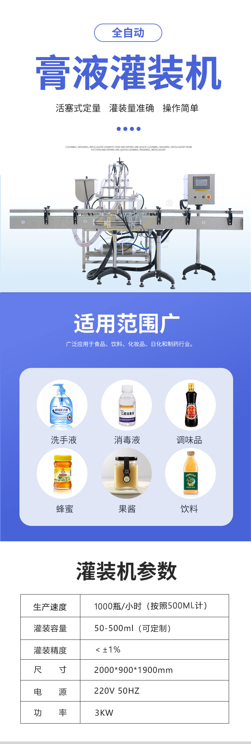 全自動膏液灌裝機適用于食品、飲料、化妝品、日化和制藥行業(yè)。灌裝頭設有特殊防漏裝置,灌裝無拉絲,滴漏現(xiàn)象。