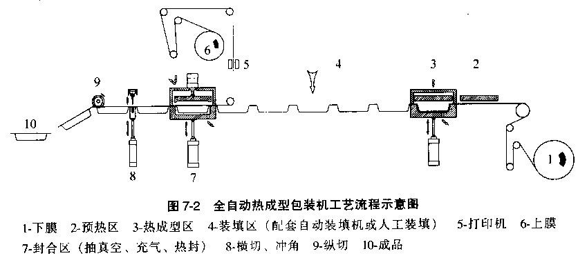 包裝的全過稅由機器自動完成,根據(jù)需要,裝填可采用人工或機械實現(xiàn)。內(nèi)流程圖可見,下卷膜經(jīng)牽引以定步距步進,經(jīng)預熱區(qū)及加熱區(qū),由氣壓、真空或沖模成型,在裝填區(qū)填充物料后進入熱封區(qū)。在熱封區(qū)中,上卷膜經(jīng)導輥后覆蓋在成型盒上,視包裝需要可進行抽真空或充入保護氣體的處理,然后進行熱壓封合。后經(jīng)橫切、縱切及切角修邊形成一個個美觀的包裝成品。至于經(jīng)裁切后的邊料可由抽吸捅或卷揚裝置收集和清理。